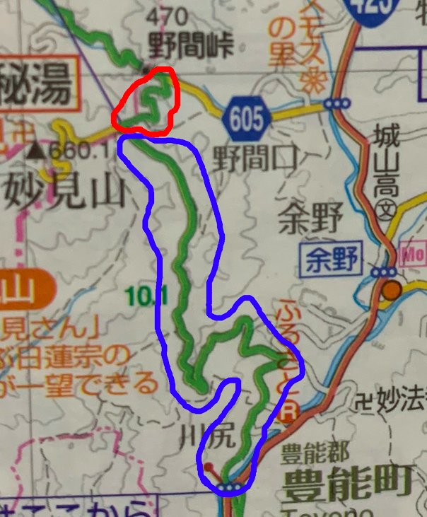 妙見山分岐からの赤丸は1.5車線のさらに落ち葉ヌルヌル要素ヘアピン強で恐怖…1速アイドリングで進んでたw pic.twitter.com/q1OkiEgfWw